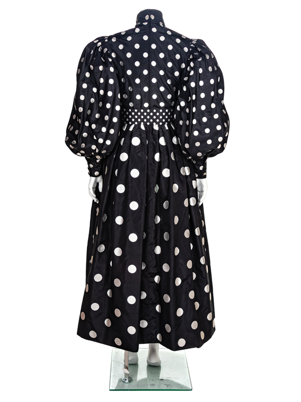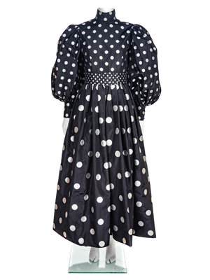 Black silk taffeta woven with white polka dots with stand collar, long full sleeves gathered into a wide cuff and a very full skirt. Center back zipper and an attached black belt with smaller polka dots. Bodice and sleeves are lined, skirt is underlined.