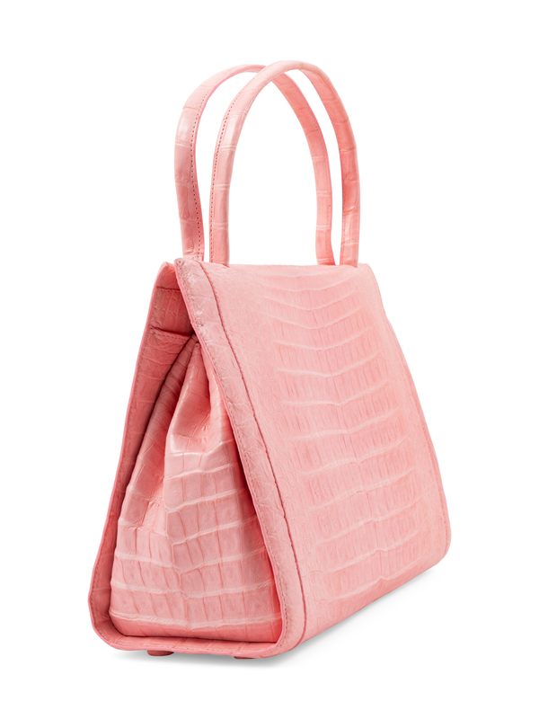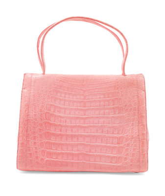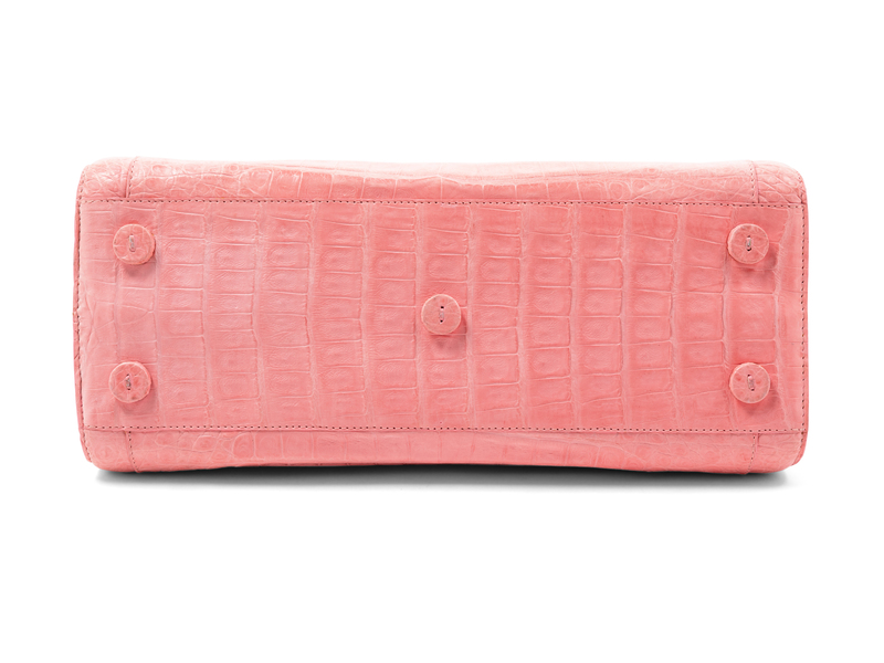 Pink crocodile with goldtone hardware, accordion gusset, beige interior lining with a center zip pocket and two interior compartments; one with slip pocket and zip pocket, the other with a slip pocket, hidden magnetic closure at top with dual handles.