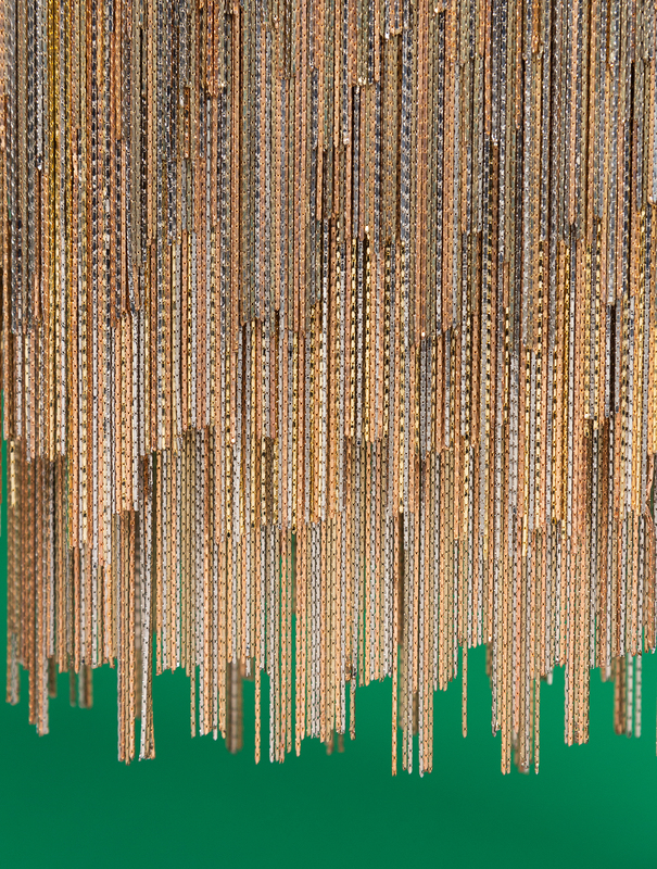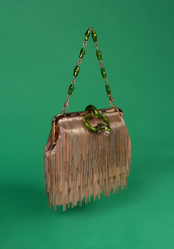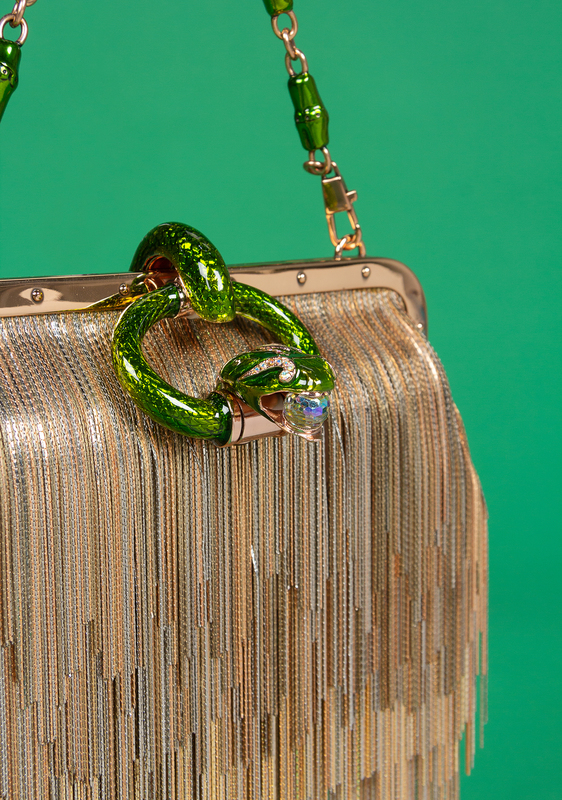 Champagne satin with rosegold tone frame, graduated chain fringe in goldtone, silvertone, and bronzetone metal, with a single removable green enamel bamboo link shoulder strap, champagne interior lining with a slip pocket, a green textured enamel snake clasp; embellished with rhinestones and a faceted round crystal. Together with a dustbag.