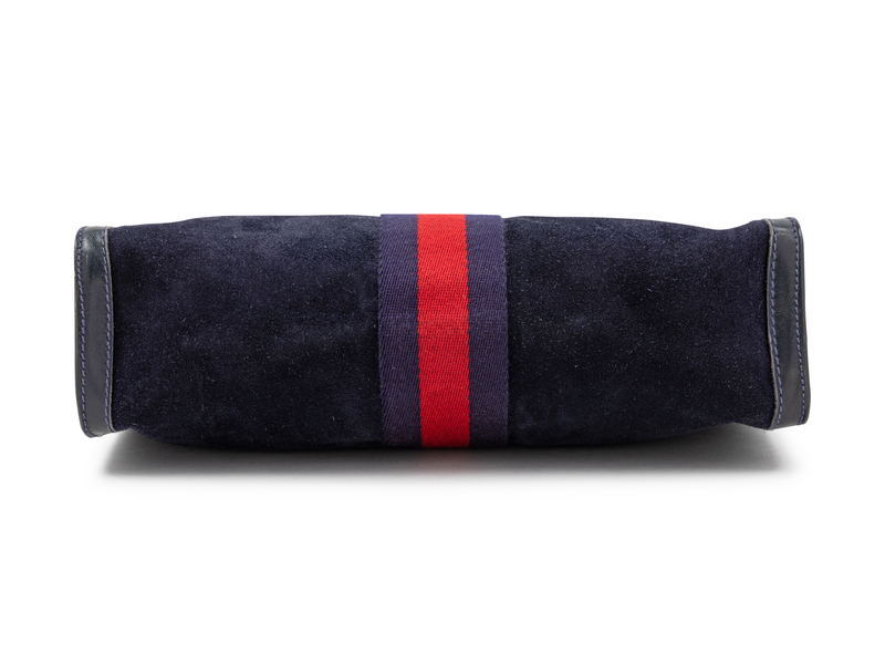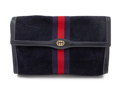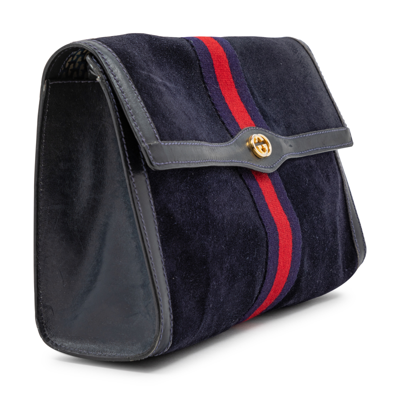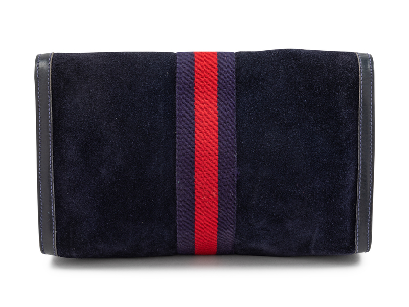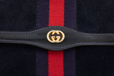 Dark blue suede with blue and red web center trim, one compartment with plastic interior lining, front flap with GG logo and a pin snap button closure.