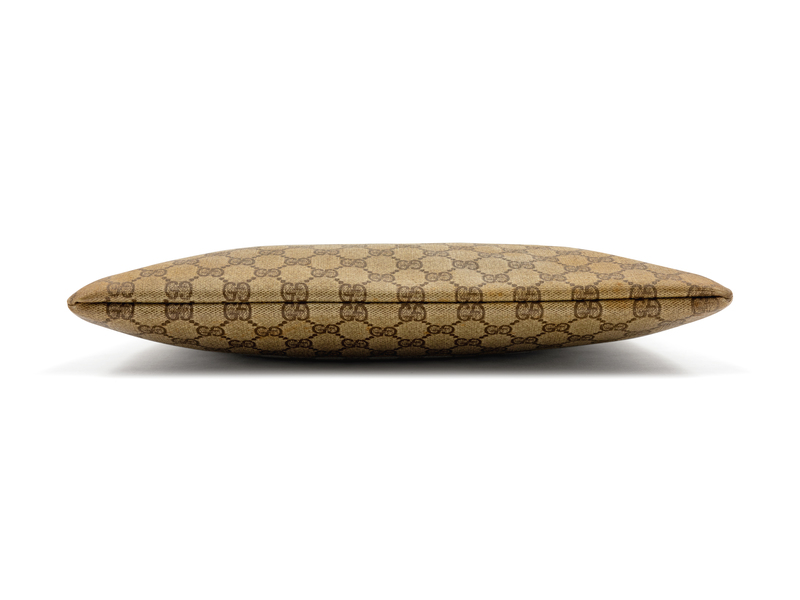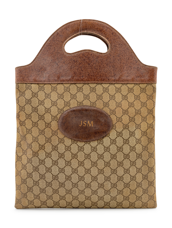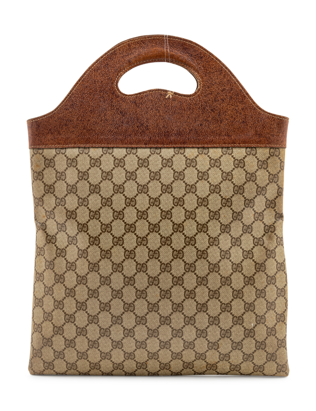 Brown GG canvas with brown leather handle, beige canvas interior, open top.