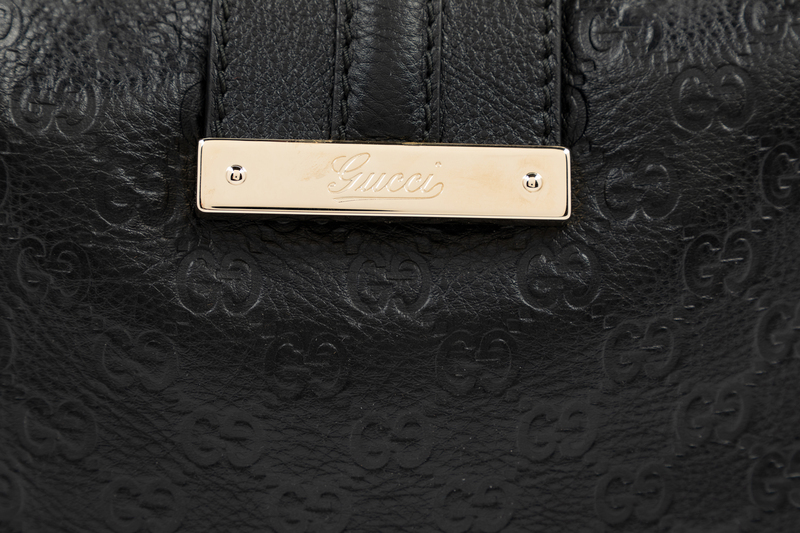 Black guccissima leather with silvertone hardware, black interior logo lining with a zip pocket, open top with center flap and magnetic snap button closure with a flat leather shoulder strap. Together with a dustbag.