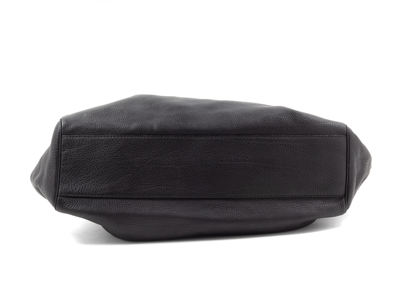 Black leather with silvertone hardware, an O ring with GG logo tag, cream canvas interior lining with one zip pocket, open top with center leather tab and magnetic snap button closure with dual leather handles. Together with a dustbag.