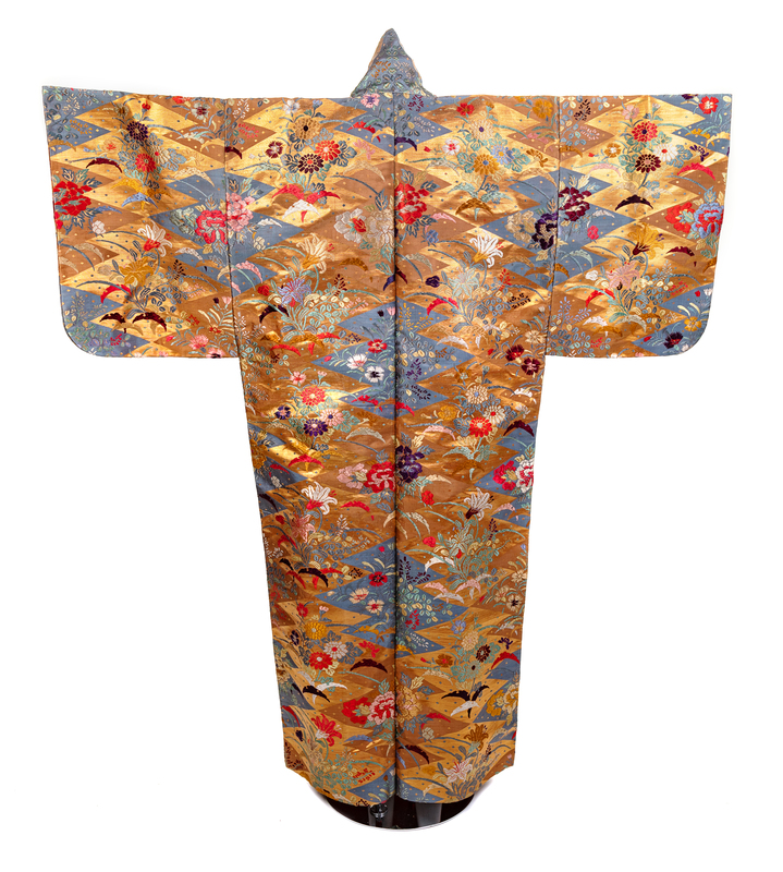 Elaborately woven fabric in gold lamé and silk thread in a geometric zig-zag pattern with colorful floral blooms and fauna. The robe is open down the center front, which crosses over when worn. The robe is lined in a deep red silk. Each seam is sewn by hand.