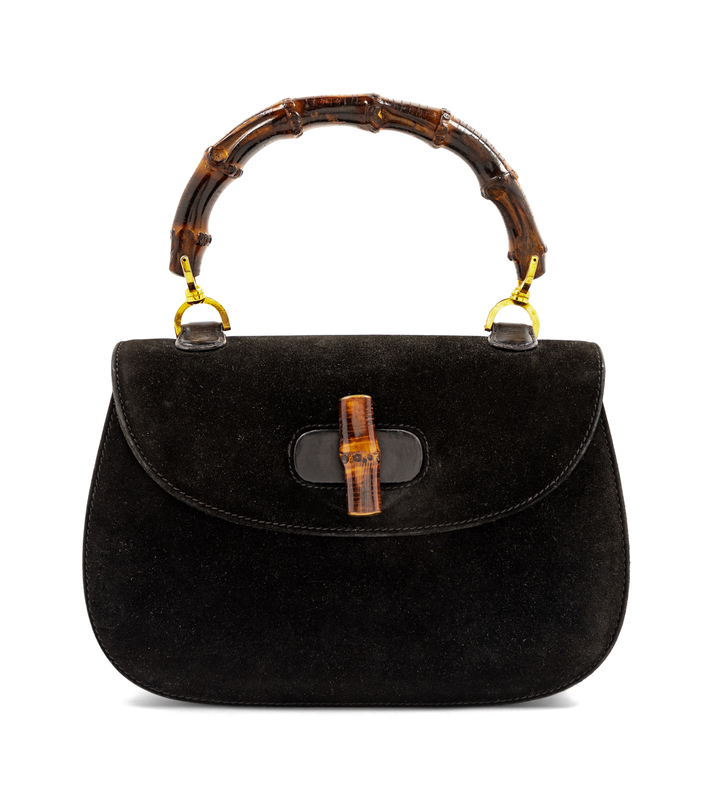 Overall very good condition/consistent with age and use. Wear on base of bamboo turn lock and front flap suede from rubbing of turn lock, light wear of suede on back most notably on left side, moderate wear and tarnish on hardware for bamboo handle, slight wear on interior from age and lite use.