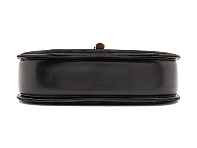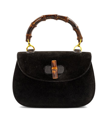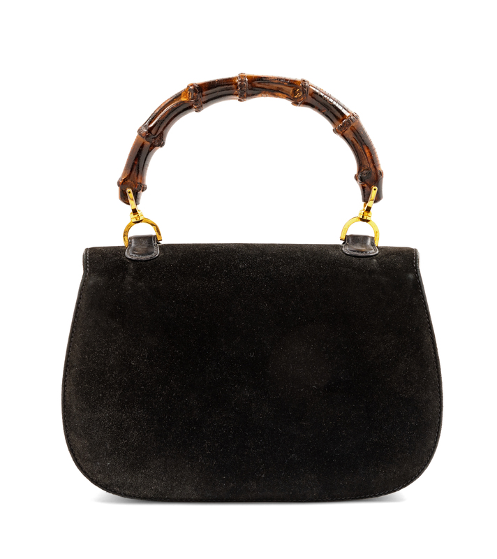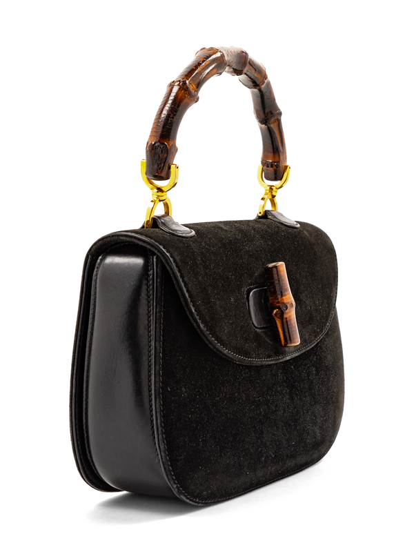 Black suede with black leather gusset and base, goldtone hardware, black leather interior with two slip pockets and zip pocket with lift boy pull, front flap with turn lock bamboo closure with bamboo top handle.