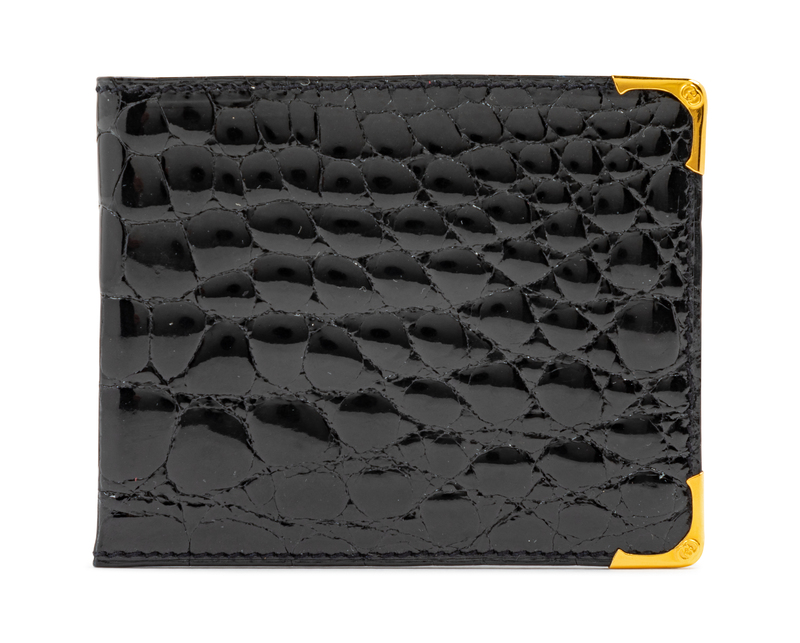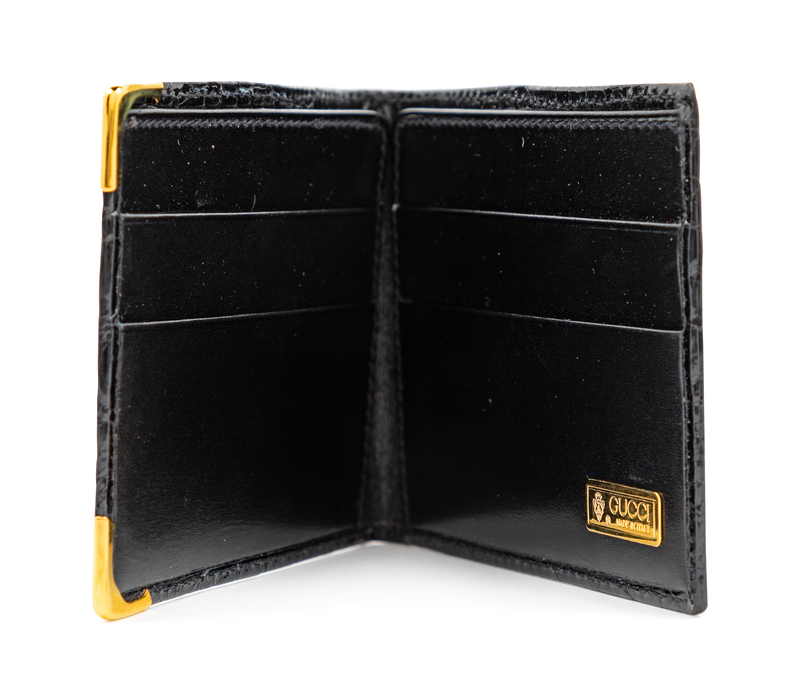 Black skin wallet with two goldtone corners stamped with GG logos. Internal card pockets in black leather.