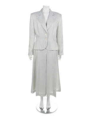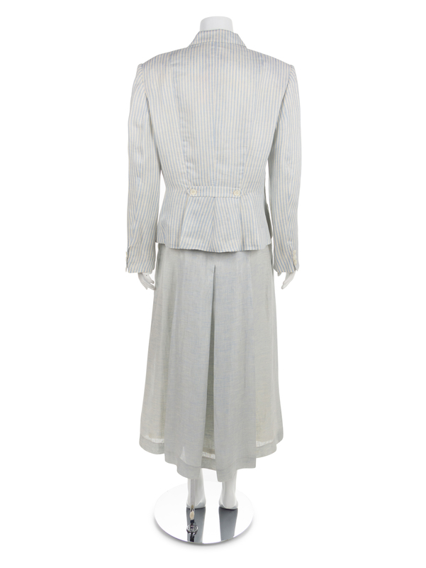 Jacket is made of blue and white vertical striped linen with a notched label, long sleeves and a center front button closure. Two hips pockets (not opened) and a center back attached belt and buttons. Fully lined. The skirt is made of blue and white woven thread and made with deep pleats into the waistline, which is finished with a brown leather and goldtone belt. One slip pocket on each hip. Fully lined and closes with a side zip.