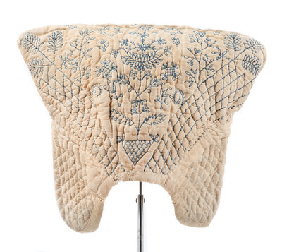 Traditional French quilted cap made of off-white cotton embroidered in blue thread. The cap has two tucks on each point and is embroidered in a floral pattern at the center front and in a grid pattern on the sides. The cap is underlined with a coarse off-white linen. Sewn and embroidered entirely by hand. Inside the tucks on the side reveal a much brighter white cotton and blue thread. Circumference: 23.5", hat height: 8.5"