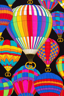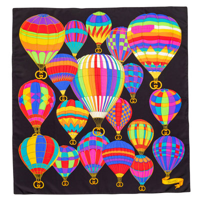 Black silk scarf with multicolored hot air balloon motif.