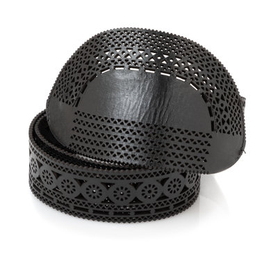 Perforated black leather belt with a large buckle and hook closure.