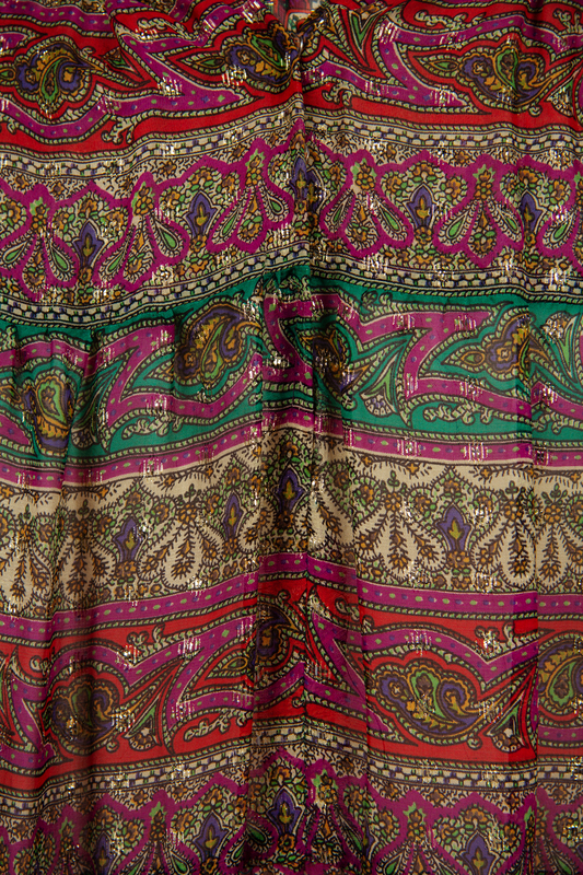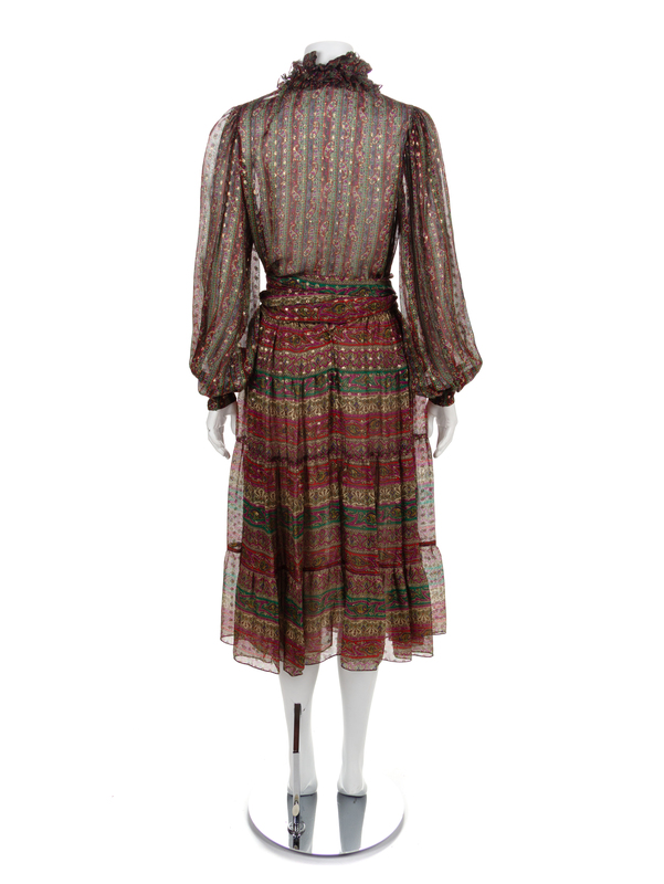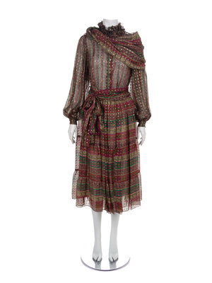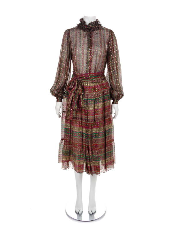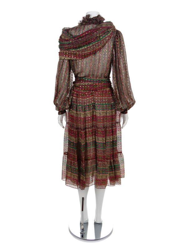 Ensemble consisting of blouse, skirt, belt and tie made of sheer fabric printed with a striped pattern and paisleys and woven with gold lame thread. The blouse has crew neckline with a gathered collar, long sleeves gathered into a cuff and a center front button closure. The long skirt is made with four tiers of fabric slightly gathered into one another and lined with a sheer cream material. The skirt closes with snaps and a bar at the waist. The belt and tie are made of the same material as the blouse and skirt.