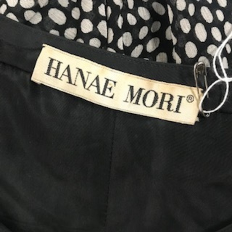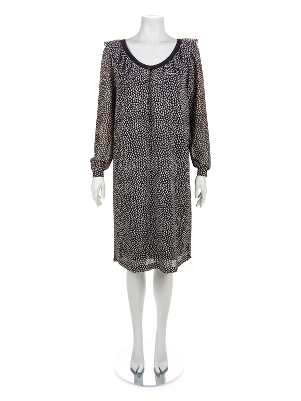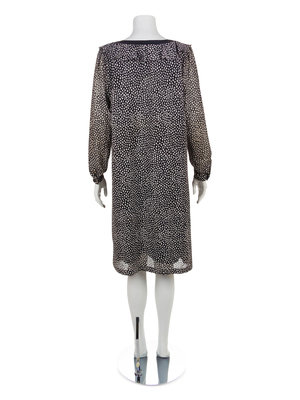 Light black crepe dress printed with white circles. The dress is cut with a wide scoop neckline trimmed with black fabric and a ruffle of self-fabric. A short buttoned placket closes the dress at the center front. The long sleeves are finished with a buttoned cuff. The dress is lined in black fabric and the sleeves are unlined.