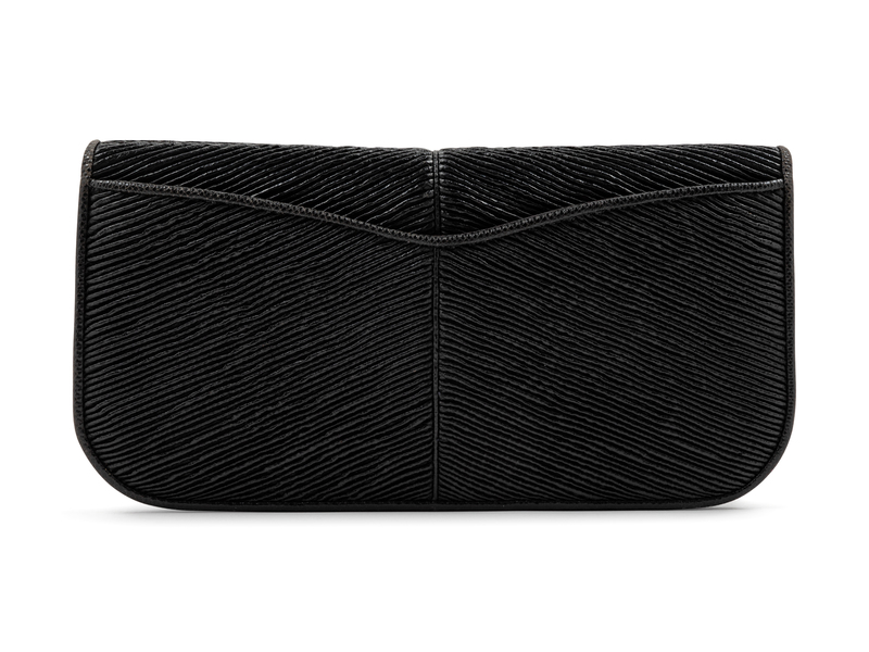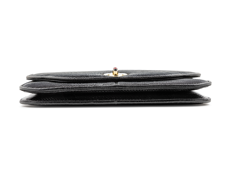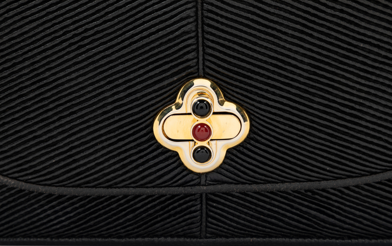 Black ribbed leather with skin trim, goldtone hardware, back slip pocket, black interior lining with a slip pocket and zip pocket, front flap with jeweled turn lock closure with a removable flat skin shoulder strap.