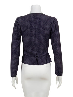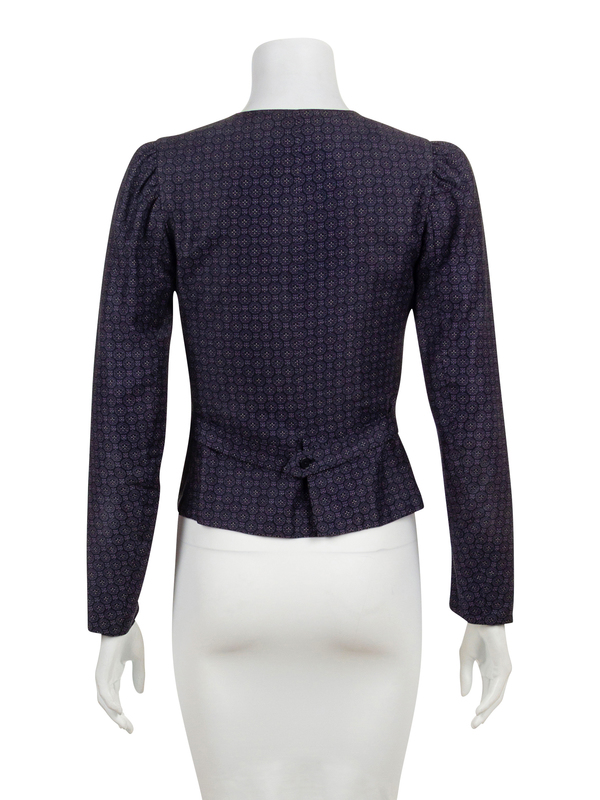 Black with purple floral and geometric motif, gathered shoulders, four front patch pockets each with a single button, back belt with single button, black lining with a front button closure.