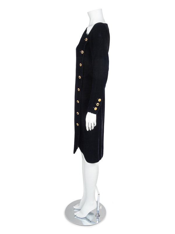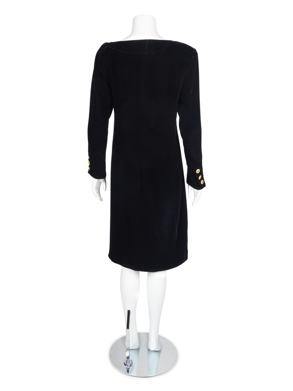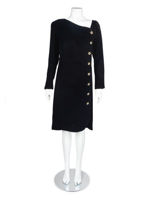 Black silk velvet dress with asymmetrical wide neckline pulled into an off-center opening down the front of the dress, which is closed with goldtone and rhinestone buttons. Long sleeves are finished with three goldtone buttons and buttonholes. Dress is lined.