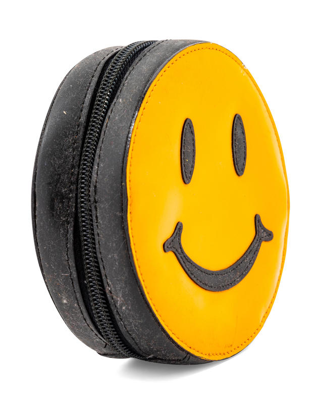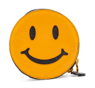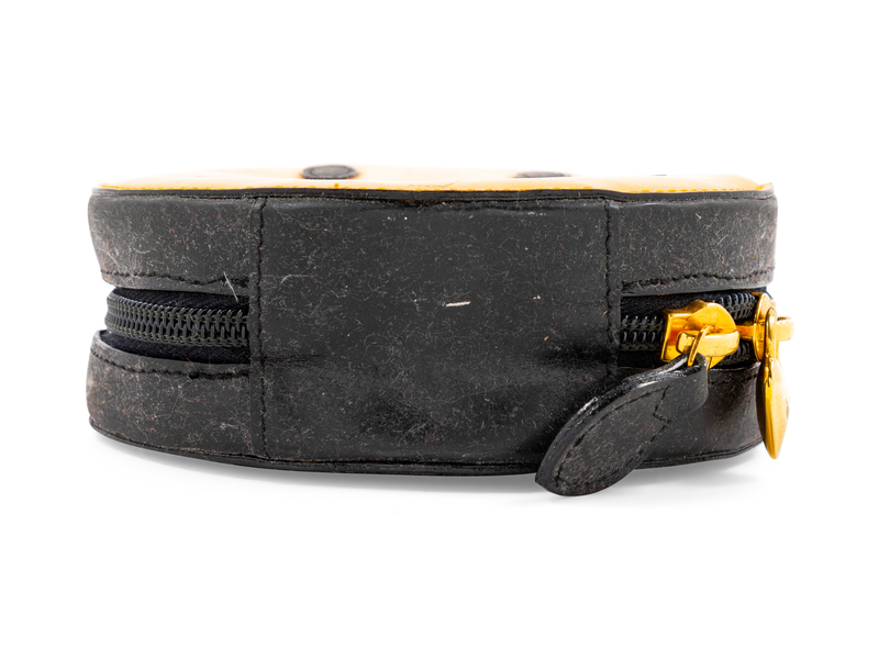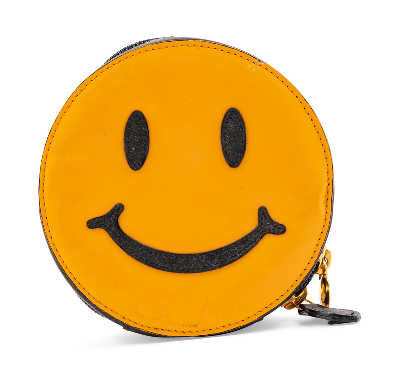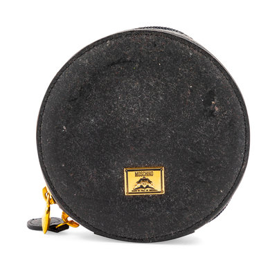 Circular black clutch with yellow/orange smiley face on one side with a central zip and long shoulder strap. Bag is lined with Moschino woven fabric and has two three internal compartments with a central zip.