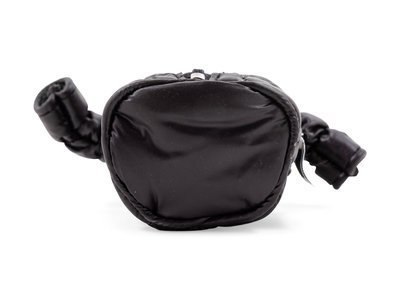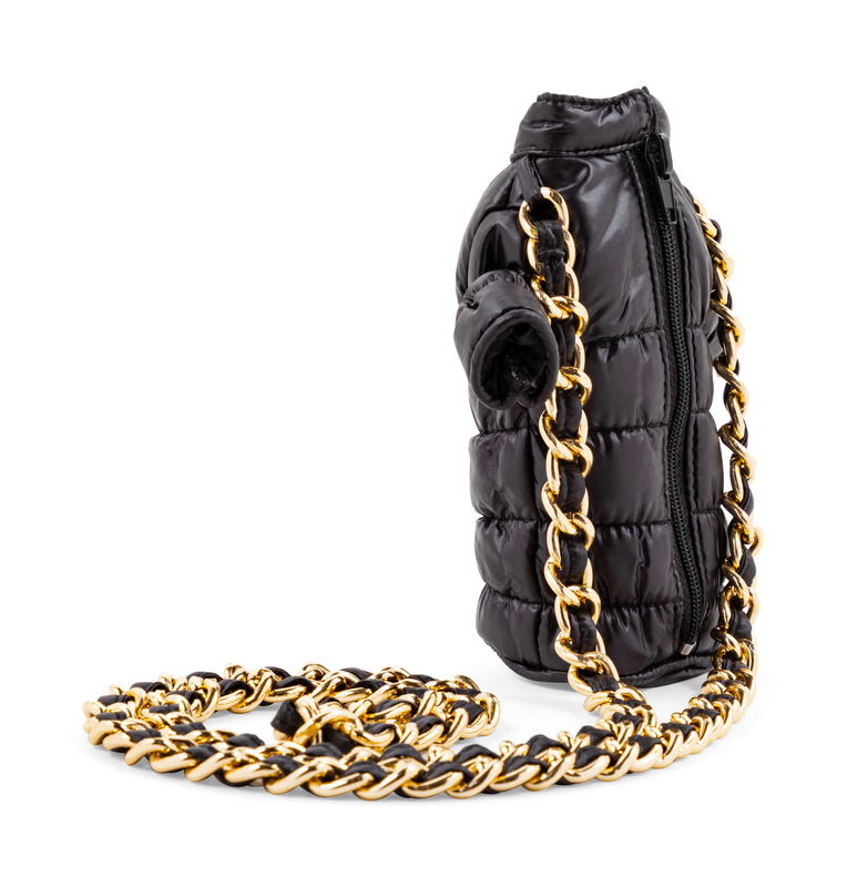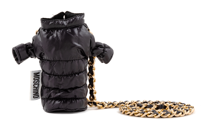 Black down coat with stand collar, long sleeves and a center front zip. Attached to goldtone chain strap and with an exterior 'Moschino' tag and interior logo fabric lining.