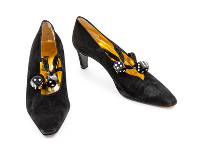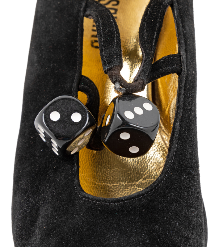 Black suede shoes with two black and white dice attached to two black suede straps across the vamp. The shoes have a pointed toe, set back, straight heel and a gold leather lining.