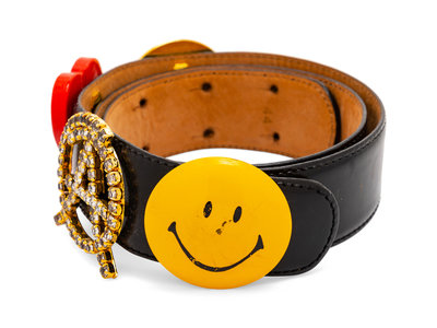 Good condition. Loss to surface of patent, light scratching to heart and peace sign insignia, loss to paint on surface of smiley insignia, row of five darkened rhinestones on top of anarchy insignia.