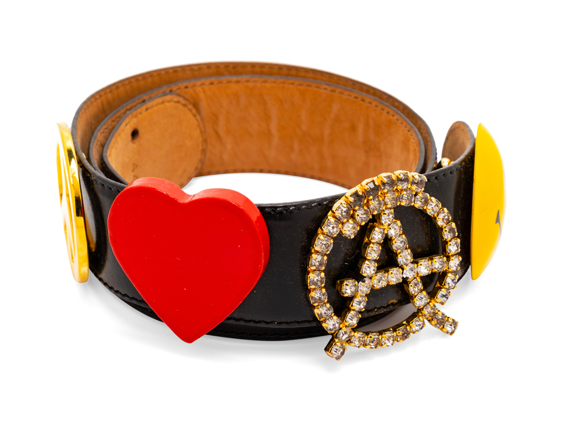 Black patent leather belt with four icons: painted heart, smiley face, goldtone peace sign and rhinestone anarchy sign. The belt closes with a double punch pin closure.