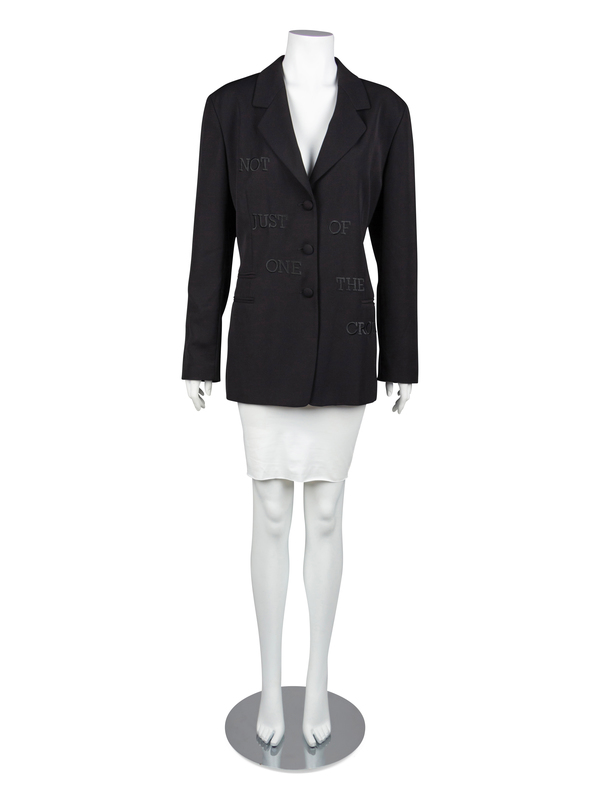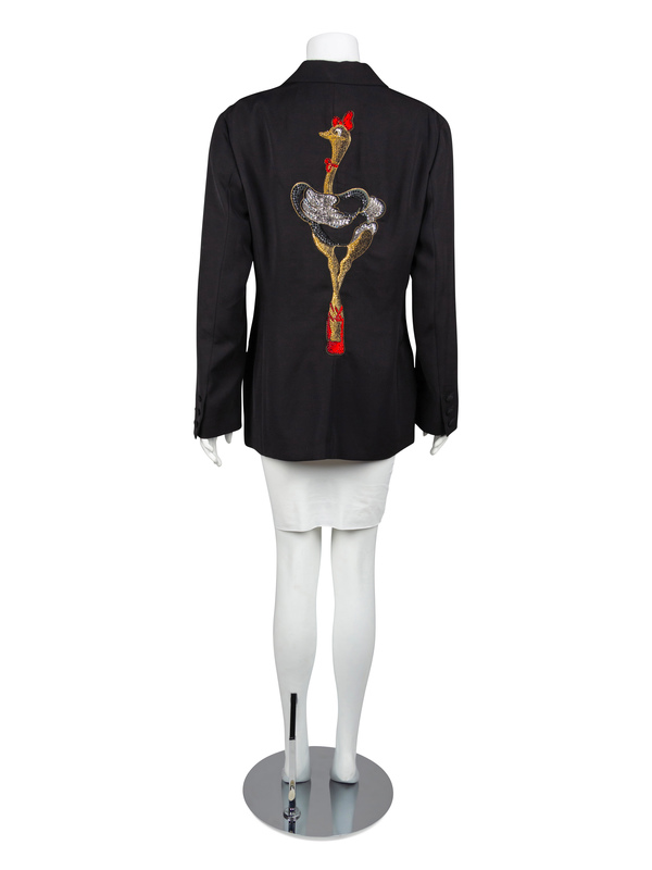Black crepe jacket embroidered with the words 'Not Just One of the Crowd' in black thread. The back of the jacket features a large embroidered ballet dancing ostrich that is decorated with faceted crystals. The jacket is cut with a notched lapel, long sleeves and a center front covered button closure. Fully lined. Left hip pocket is open and contains a bag with two extra buttons. The two right pockets haven't been opened.
