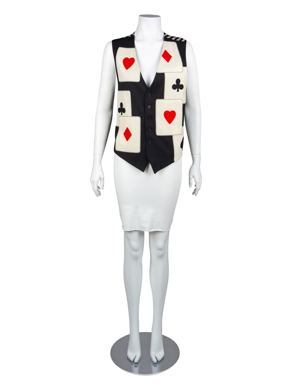 Black wool vest with white wool playing card appliques on front. The back and lining of the vest is made of a vertical stripe black and white fabric and there is a center back belt. The vest closes down the center front with buttons.