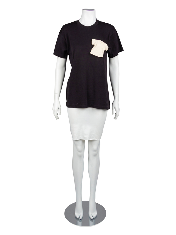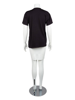 Black cotton t-shirt with small white t-shirt detail on left front.