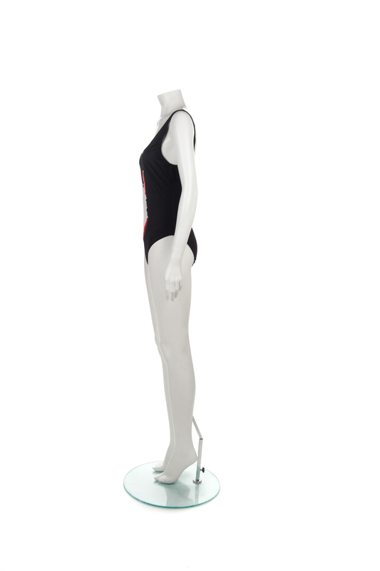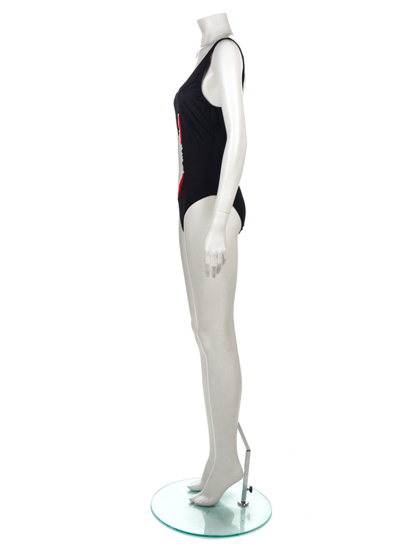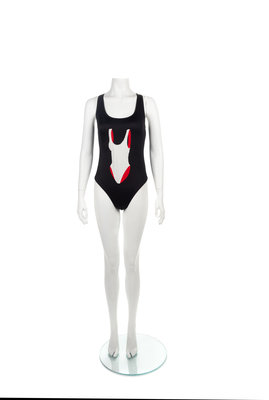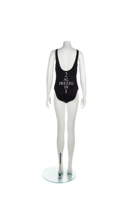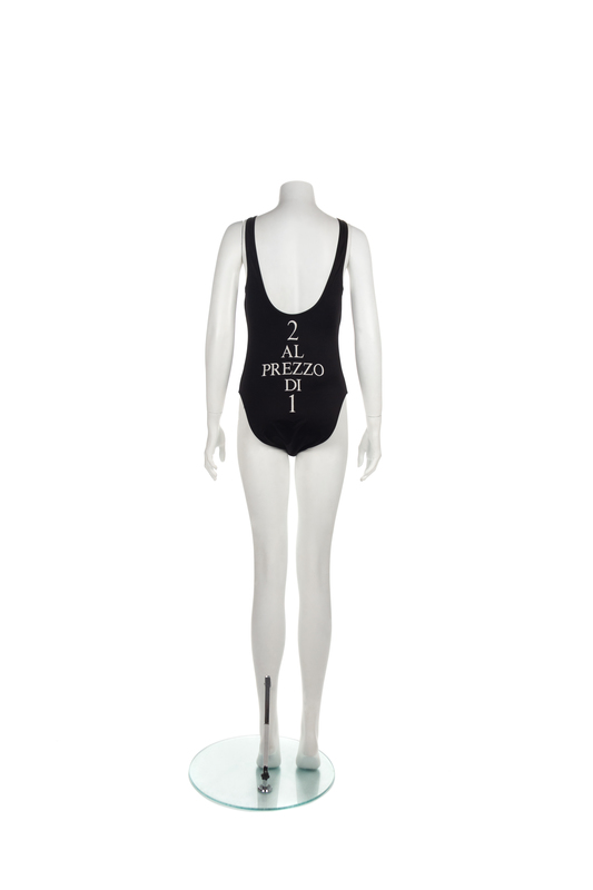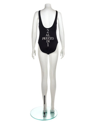 Black swimsuit with a white swimsuit appliqued on front. Embroidered on the back in white thread is '2 AL PREZZO DI 1' (two at the price of one).