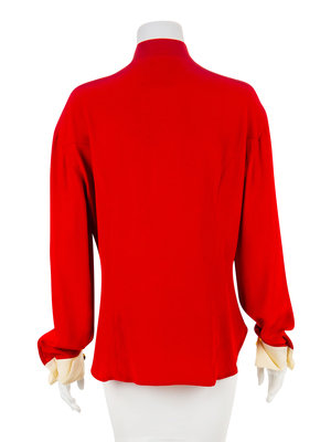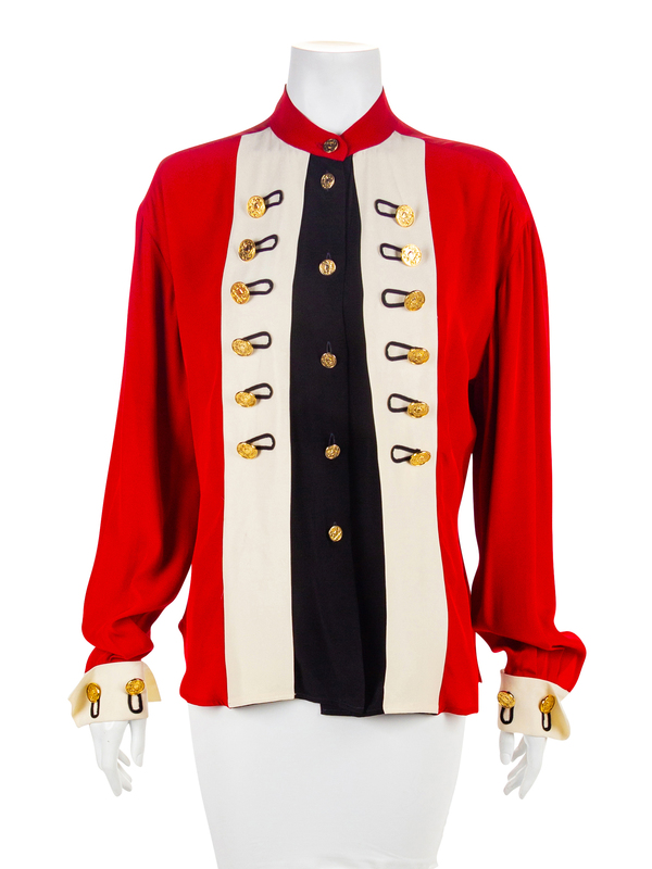 Red, cream and black shirt inspired by men's 18th century military uniforms, with a center front goldtone button closure, flanked by decorative buttons and button loops. The long sleeves are finished with a French cuff and goldtone button closure, which is embellished with more decorative buttons and button loops. center front gold coin button down shirt with larger gold coin button detail on front and sleeve cuffs.