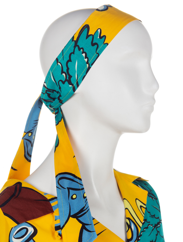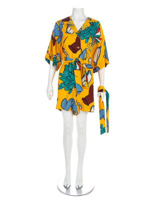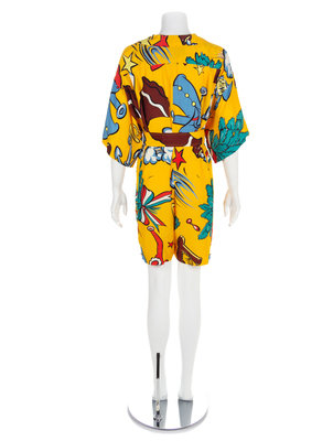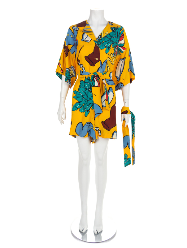Yellow, blue, green, red and brown Popeye-themed print, short sleeved, notch-collared jumper. Center front closure with gold coin-like buttons that read "cheap and chic." With two self-tie belts. Slip pocket sewn into each side seam.