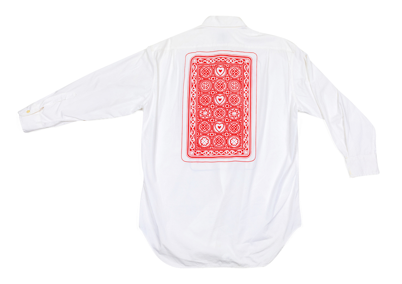 White cotton dress shirt printed with the Ace of Hearts on front and the back of a playing card, with hearts, smiley faces and other shapes, on the back. Below the central heart on the front is the silhouette of a person smoking a pipe. The center front button closure has the buttons on the right (menswear).