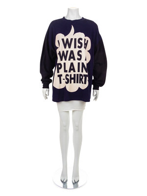 Long sleeve blue cotton sweatshirt with black sleeves and a black back. The front is printed with a large white text bubble that reads 'I WISH I WAS A PLAIN T-SHIRT'.