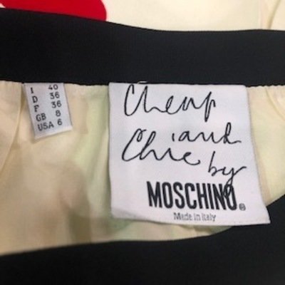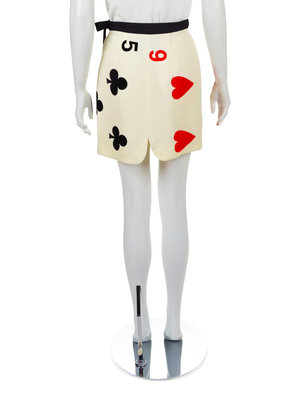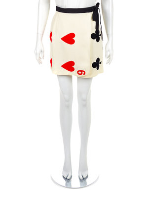 White wrap skirt with a white playing card motif of a black 5 of Clubs on the left and a 6 of Hearts on the right. A black waistband wraps the skirt and ties on the side. The skirt is lined.