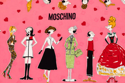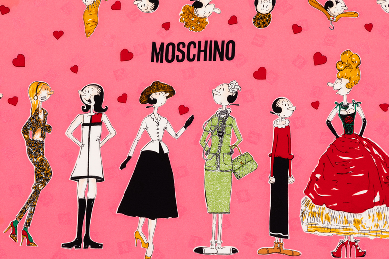 Pink silk scarf woven with the letter of 'MOSCHINO' and printed with fourteen Olive Oils from the Popeye cartoon wearing different fashion styles, including Christian Dior's New Look from 1947 and Yves Saint Laurent's Mondrian Dress.