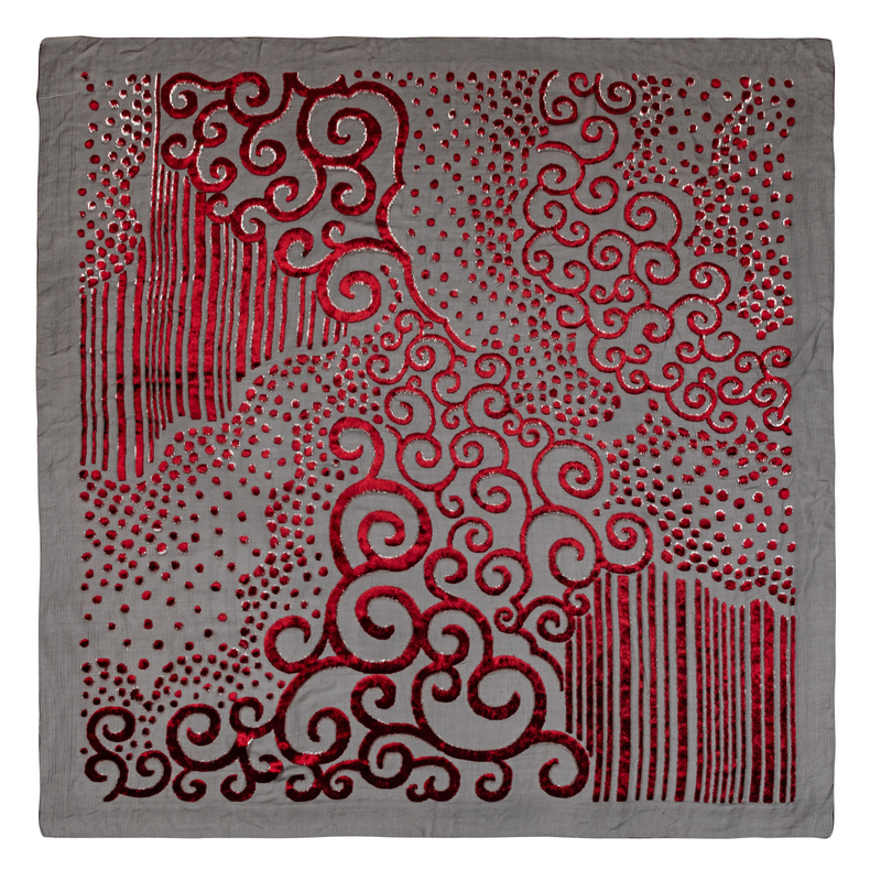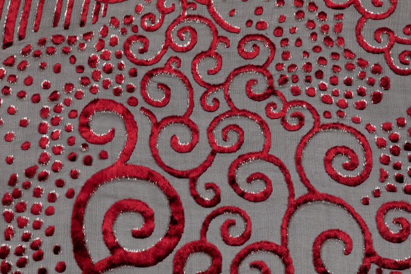 Black ground with a red velvet in a burnout pattern of swirls, dots and lines.
