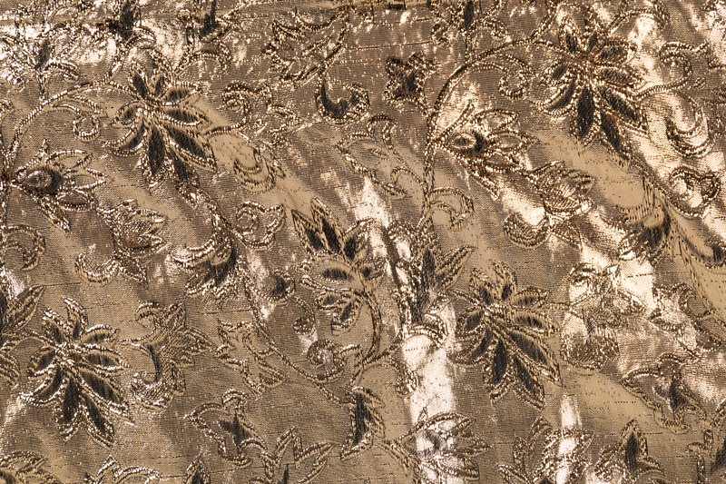 Long rectangular gold lamé in an all over woven pattern of flora and fauna.