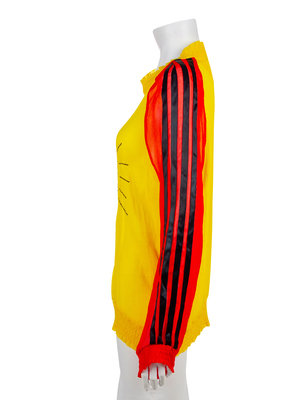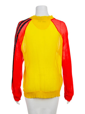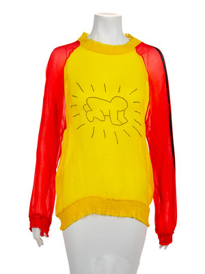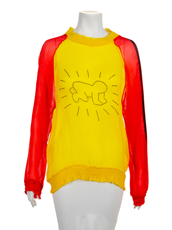 Yellow with red sleeves sheer silk crepe top with Keith Haring's 'Radiant Child' in blue crystals. The crew neckline, sleeve and top hems are slightly gathered. The left red sleeve is embellished with strips of black satin ribbon. The top is pullover in style with no closures.