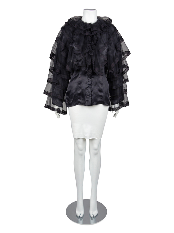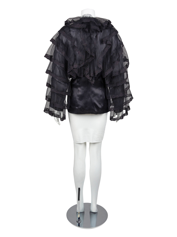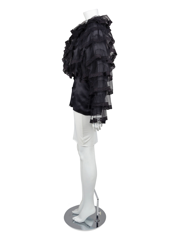 Black sheer silk blouse trimmed with numerous peplums of black net trimmed with black lace. The peplums cover the bodice from the waist up and down the sleeves. The bodice is cut with a crew neckline, long sleeves and a center front button closure.