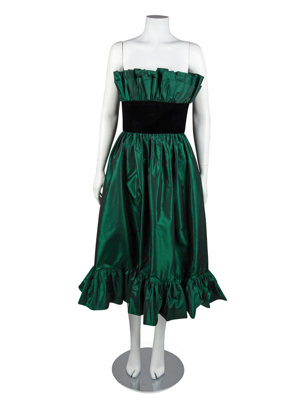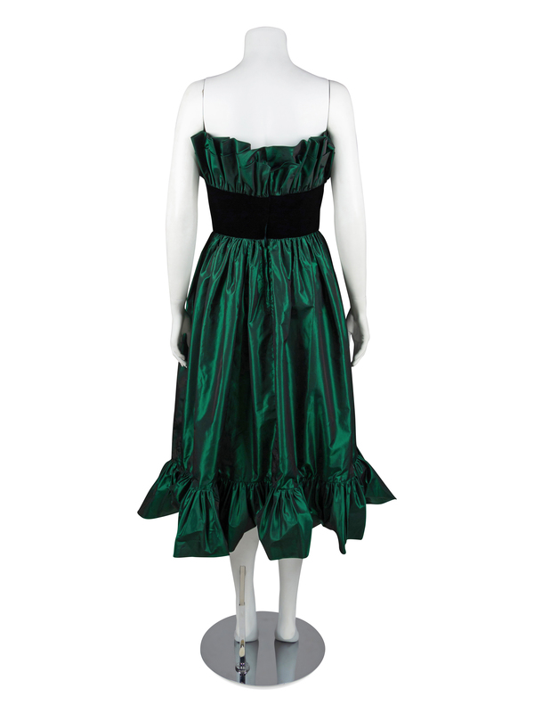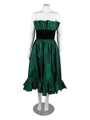 Black and green iridescent taffeta strapless dress with a wide waistband of black velvet. The top of the bodice and the hem of the skirt are trimmed with a wide band of heavily gathered self fabric. The bodice is boned and lined with self fabric. The skirt is supported by a single layer of black net. The dress closes down the center back with a zip and hook and eye.