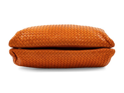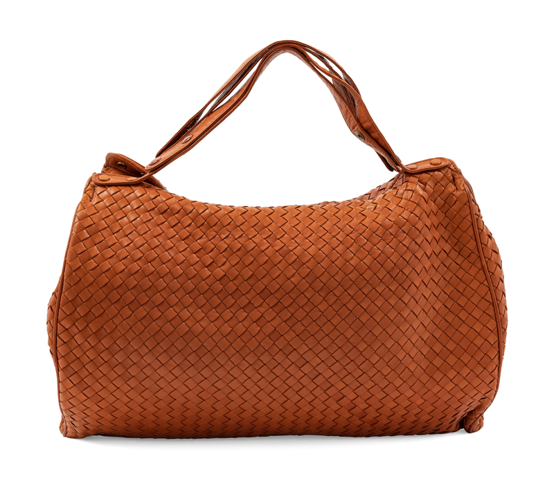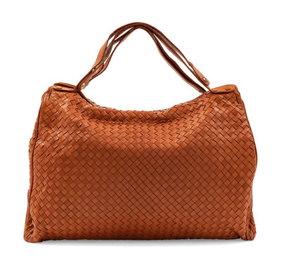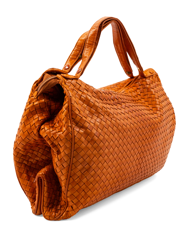 Large brown leather intrecciato bag with expandable section secured with snaps. Thin straps form the handle, which is also expandable with snaps. Bag is lined with brown leather.