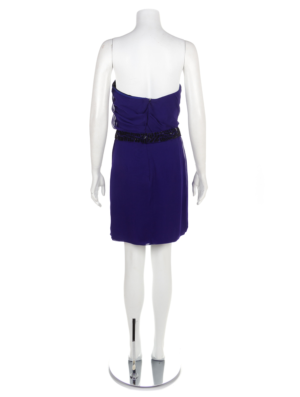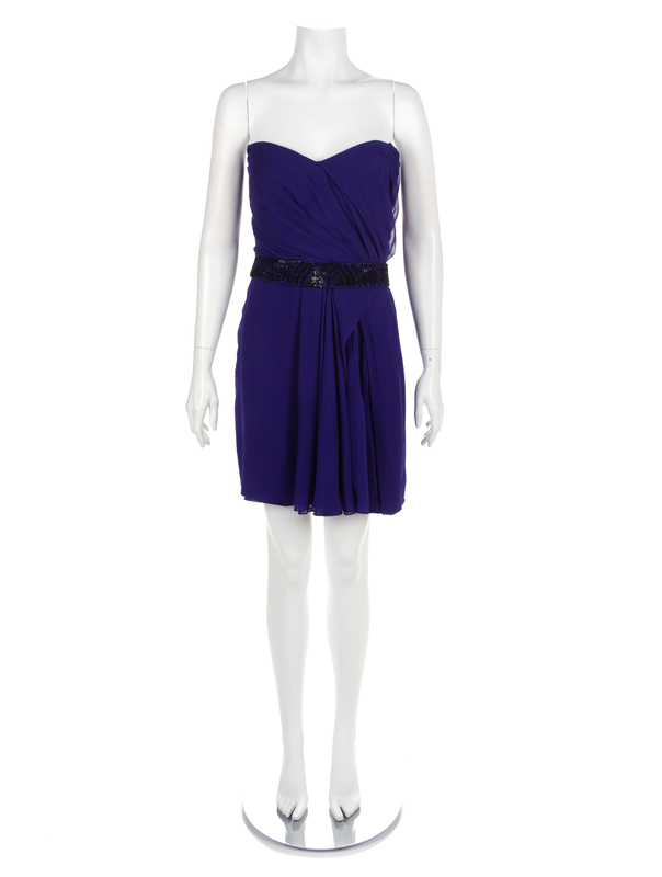 Strapless blue/purple silk crepe dress with a draped design secured to an inner boned bodice. The pleated underlayer and draped exterior of the skirt are gathered and tucked into the waistline, which is embellished with a black sequin embroidered belt. The dress and and boned inner bodice close down the center back with a zip.