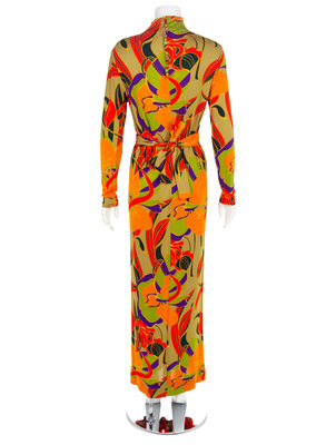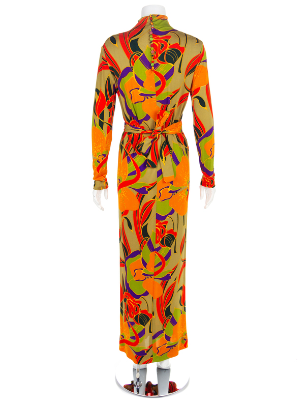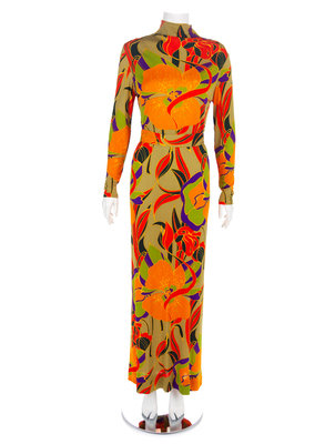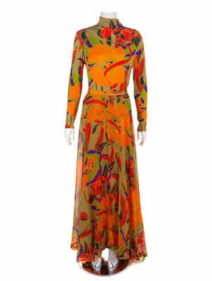 Three-piece dress of printed silk knit and crepe in a floral pattern. The long knit dress has a stand collar, long sleeves and a center back neck placket with self-fabric covered buttons and loops. With self-fabric belt. A sheer silk crepe over skirt accompanies the ensemble and ties in the front.