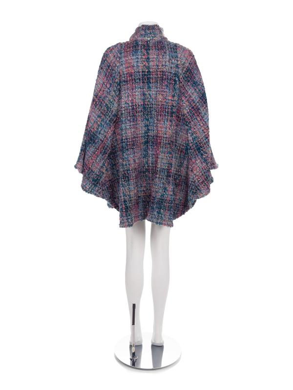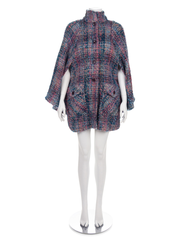 Blue, pink and white woven wool and mohair blend boucle with center front button closure and a pocket over each hip. An opening in each seam down the side/front allows for the arms to come through.