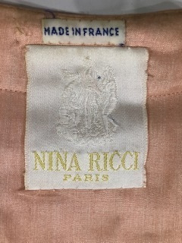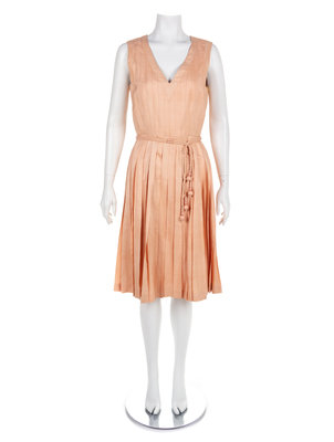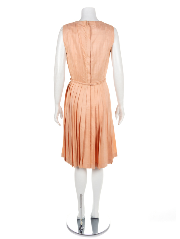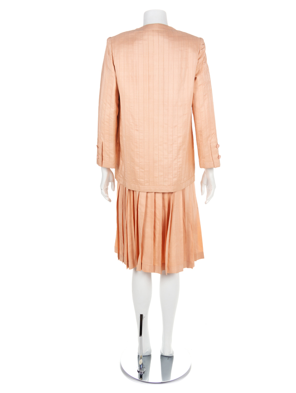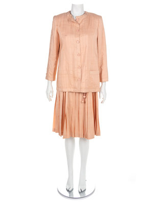Raw peach silk jacket and dress made of vertical stitched panels. Jacket has a crew neckline, long sleeves, a pocket over each hip and a center front button closure. Jacket is lined with self-fabric. Sleeveless dress has a V-neckline in front and a full skirt pleated into the waistline, which is embellished with an attache, self-fabric belt with pink balls.