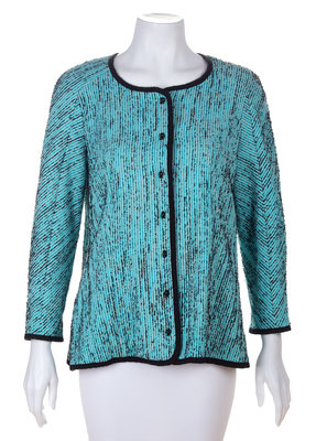 Blue black and white vertical striped bouclé jacket with wide crew neckline, long sleeves and a center front button closure. Jacket is lined.