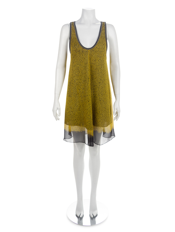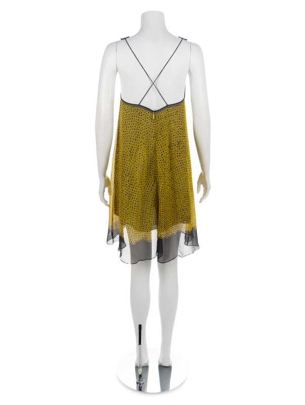 Silk crepe dress printed with a design in yellow and black. Tank top neckline with the front shoulder straps connected to spaghetti straps on the back. Dress is underlined with a thin layer of black silk and closes down the center back with an invisible zip.