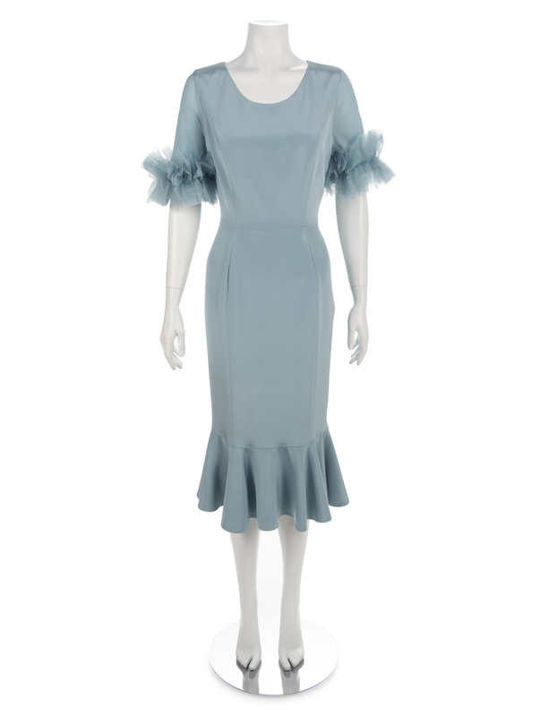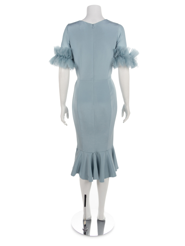 Blue dress with scoop neckline, short sleeves with sheer fabric hem and a flared skirt with a hem peplum.