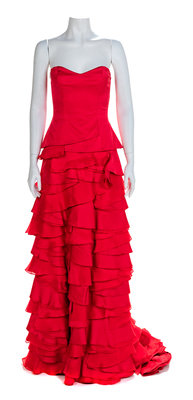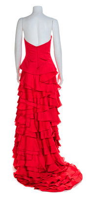 Strapless red silk dress with boned bodice and a layers skirt with full, trained hem.