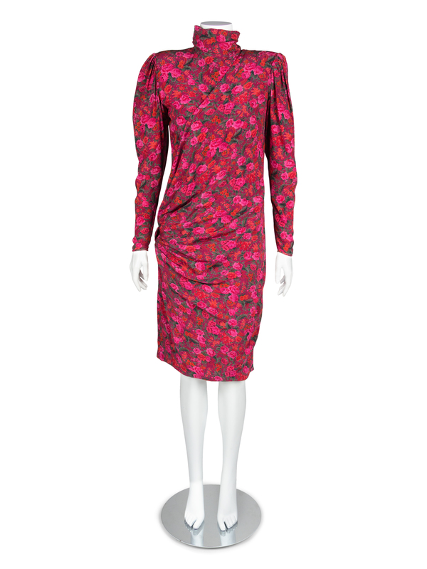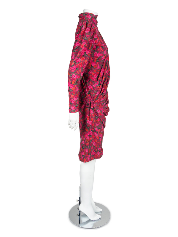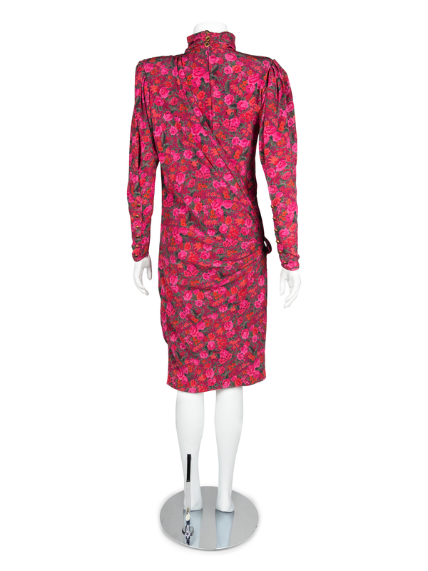 Purple fabric printed with an all over design of pink and red flowers and fauna. The dress features a dramatic drape extending from the left shoulder and pulled into deep tucks on the right hip. The large gathered sleeves are supported by large shoulder pads. The sleeves pull into a tight hem with six decorative buttons next to a zip closure. The dress has a high stand collar and closes down the center back with a zip. Fully lined.